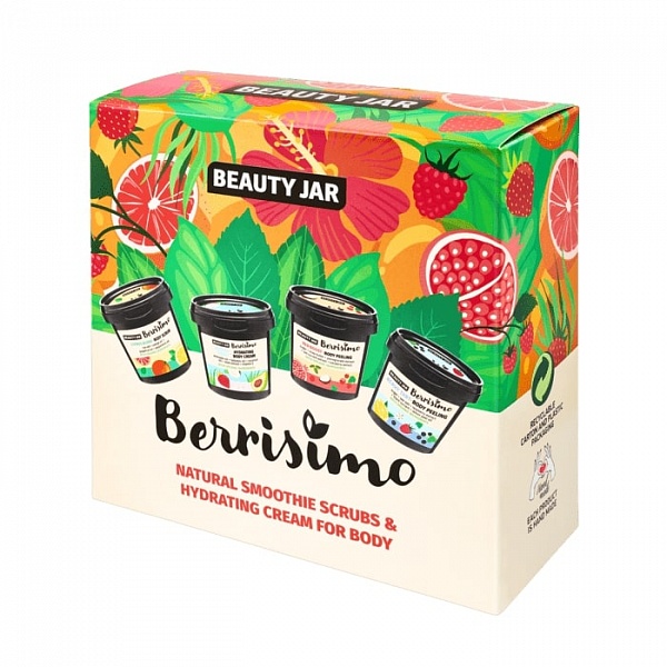 Berrisimo produkti veidoti uz dabīgu skrubējošu daļiņu, barojošu eļļu un sulīgu ogu pamata. Viss, kas nepieciešams skaistai un starojošai ādai – vienā trauciņā!1.CITRUS BLEND ķermeņa skrubis, 200g.2.RED BOOST ķermeņa skrubis, 160g.3.BERRY TART ķermeņa skrubis, 200g.4.HEALTHY DRINK mitrinošs ķermeņa krēms, 155ml