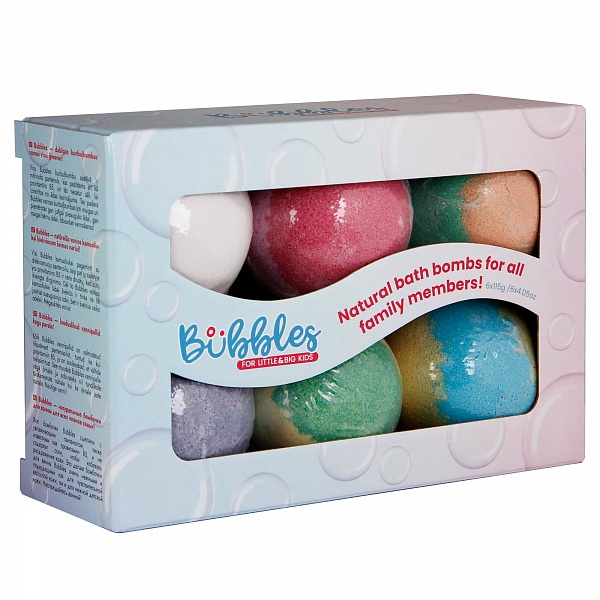 Bubbles - dabīgas burbuļbumbas vannai visai ģimenei!Visu Bubbles burbuļbumbu sastāvā ir mitrinošs pantenols, kas pazīstams arī kā provitamīns B5, un tās nesatur sāli, lai izvairītos no ādas kairinājuma.Tas padara Bubbles vannas burbuļbumbas ļoti maigas un piemērotas gan jutīgai pieaugušo ādai, gan maigai bērnu ādai. Izbaudiet vannošanos!Komplektā ietilpst:1.VANILLA BERRY - vannas bumba 115g 2.SLEEPY LAVENDER - vannas bumba 115g 3.SUMMER APPLE - vannas bumba 115g 4.JUICY MELON - vannas bumba 115g 5.BUBBLE YUM - vanna bumba 115g 6.CLEAN & CLEAR - vannas bumba 115g