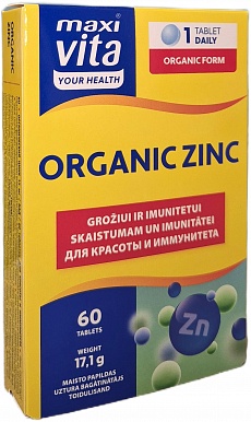 VITAR ORGANIC ZINC ir uztura bagātinātājs, kas satur 15 mg organiski saistīta cinka citrāta formā vienā tabletē. Cinks palīdz uzturēt normālu imūnsistēmas darbību, ādas, matu un nagu veselību, sekmē redzi, auglību un vielmaiņu. Piemērots cilvēkiem ar paaugstinātu cinka nepieciešamību, tostarp vegāniem, vecāka gadagājuma cilvēkiem un grūtniecēm.
